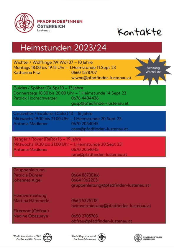 Unsere Leiter und Leiterinnen arbeiten nach den Erprogungssystemen der >Pfadfinder & Pfadfinderinnen Österreichs< und absolvieren verschiedene Seminare für PfadfinderleiterInnen, um den Kindern und Jugendlichen ein optimales Programm bieten zu können.